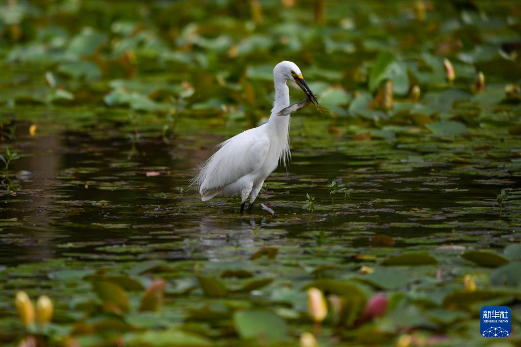 7月7日,一只白鷺在昆明滇池海洪濕地公園內捕食。新華社記者 陳欣波 攝