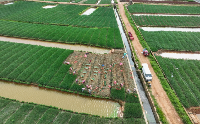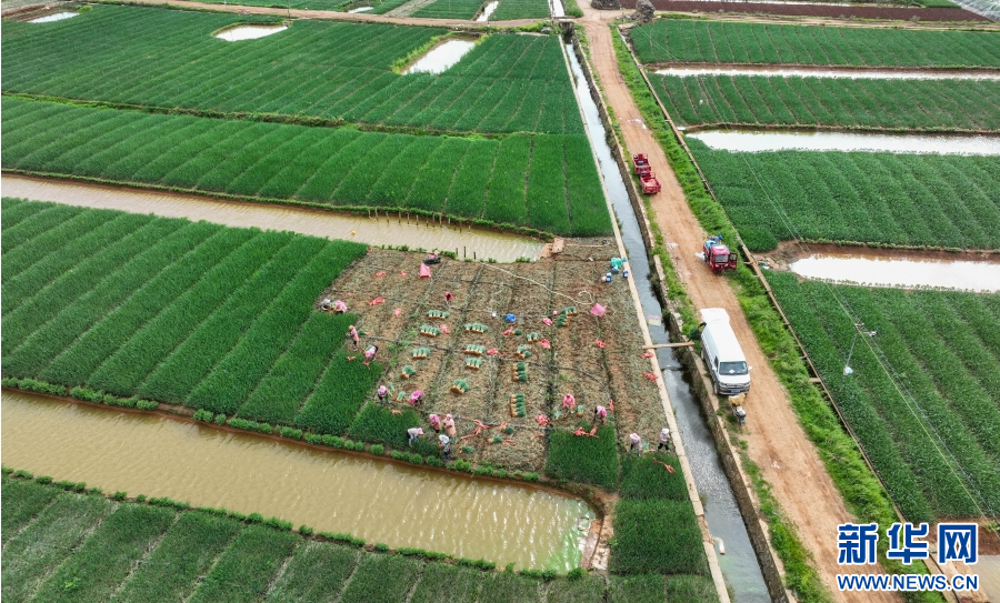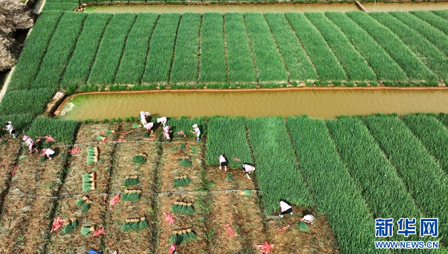 航拍云南省曲靖市麒麟區珠街街道堡子村,蒜苗采收忙(7月21日攝)。新華網發(孫文來 攝)
