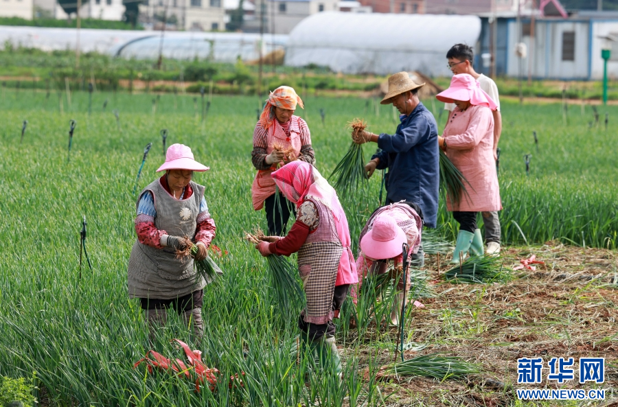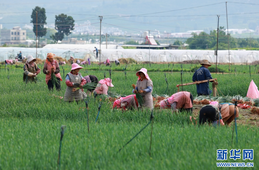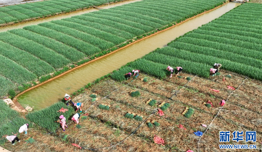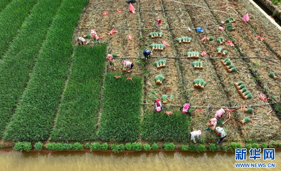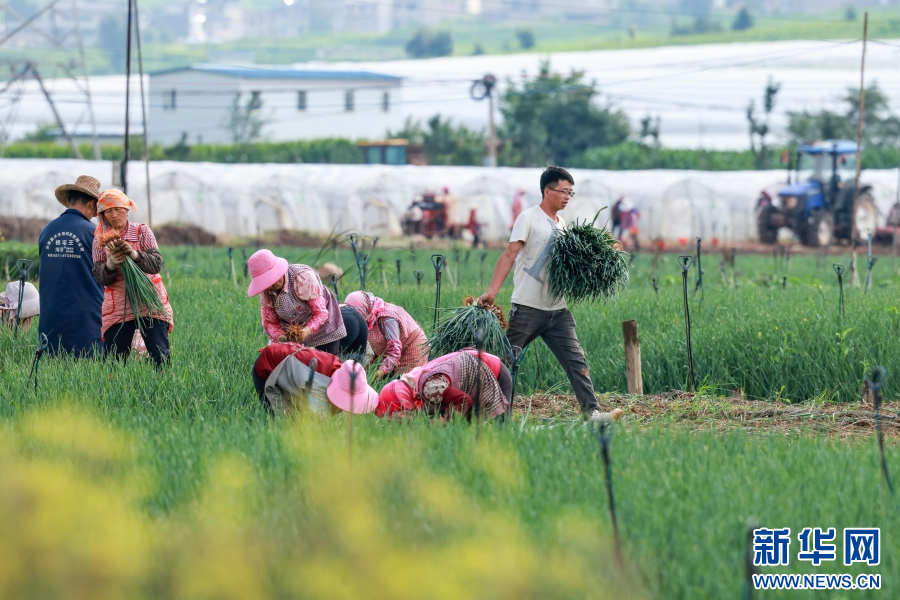云南省曲靖市麒麟區珠街街道堡子村,村民們忙著采收蒜苗(7月21日攝)。新華網發(孫文來 攝)