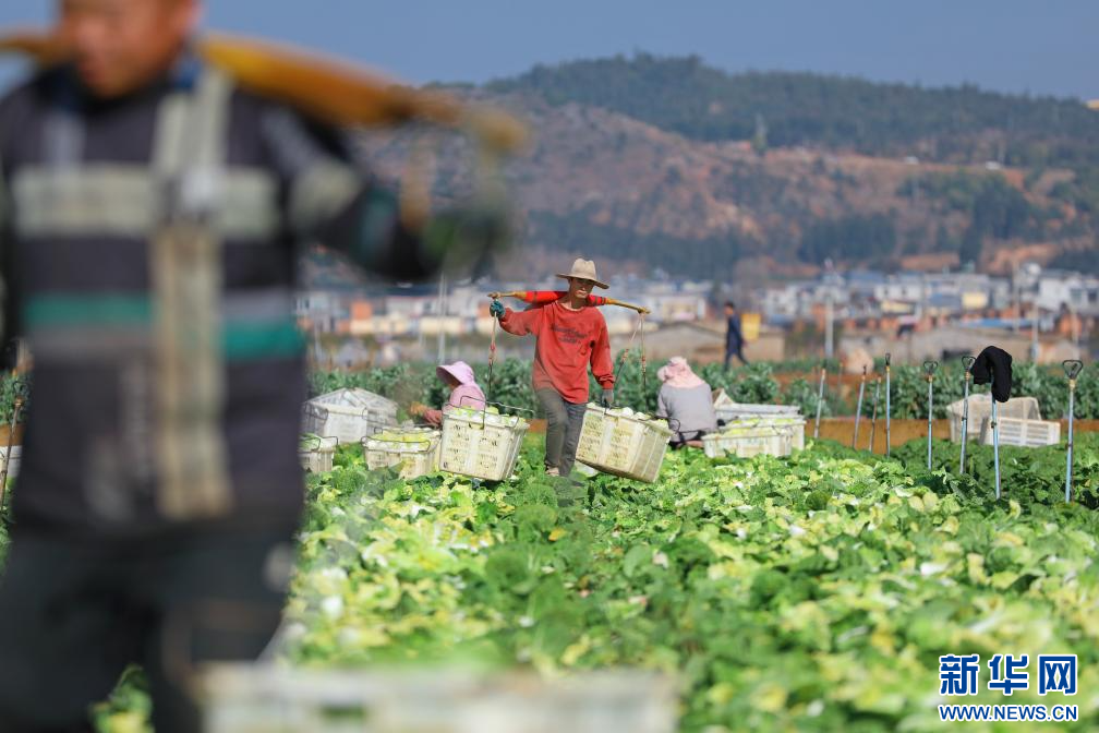 在云南省曲靖市陸良縣芳華鎮龍潭社區露天蔬菜種植基地,菜農采收新鮮蔬菜。新華社發(王勇 攝)