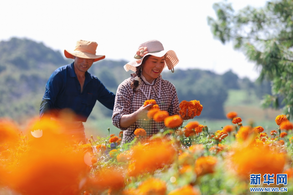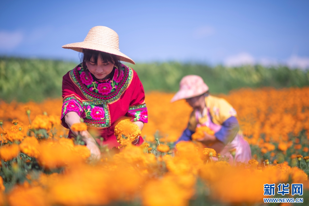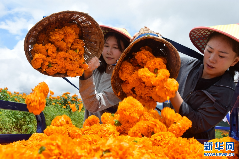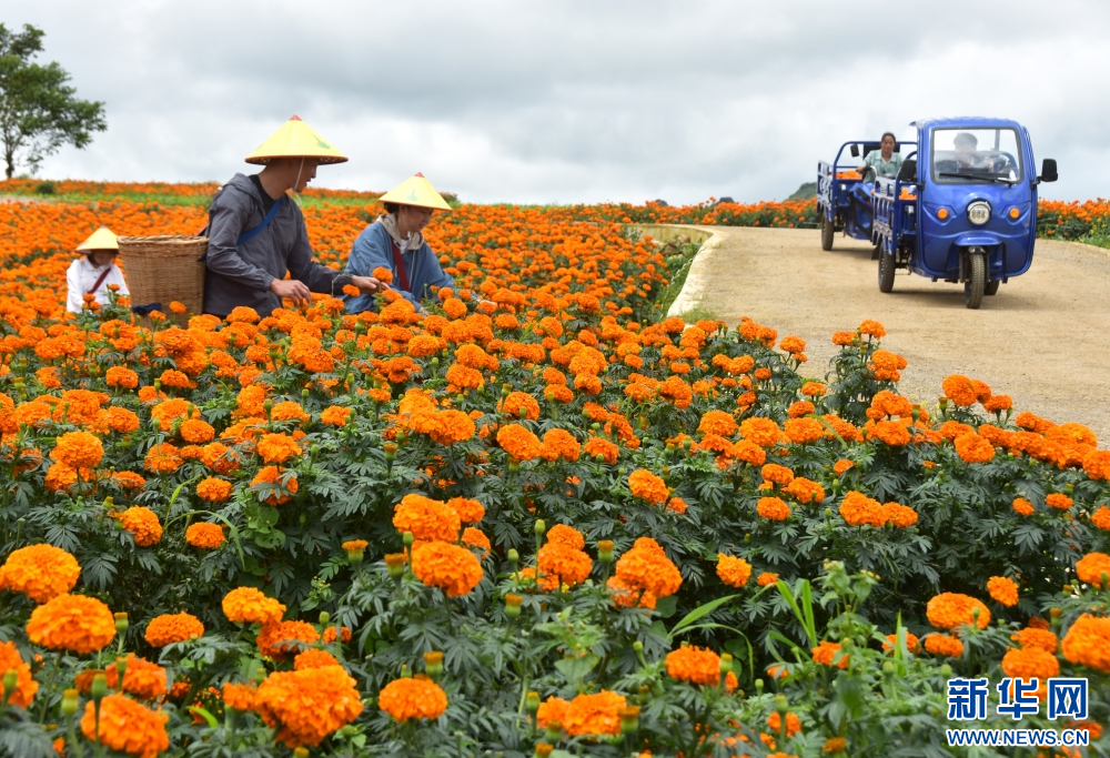 8月7日,云南省文山壯族苗族自治州丘北縣膩腳彝族鄉膩腳村的花農在采收萬壽菊。新華網發(熊平祥 攝)