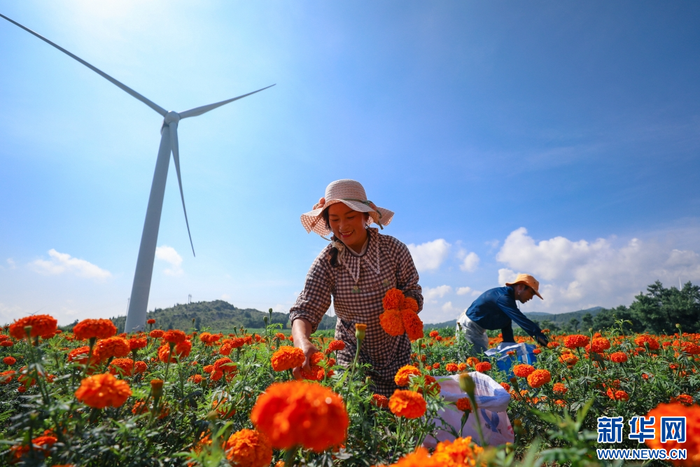 連日來,在云南省蒙自市、開遠市、騰沖市、陸良縣、丘北縣等地,漫山遍野的萬壽菊隨風搖曳,宛如一片金色的海洋?;ㄞr們忙著采摘、裝車、運輸,一派繁忙景象。萬壽菊不僅拓寬農民增收渠道,也為各地豐富旅游業態增色添景,吸引游客走進鄉村“打卡”美景,助力鄉村振興。