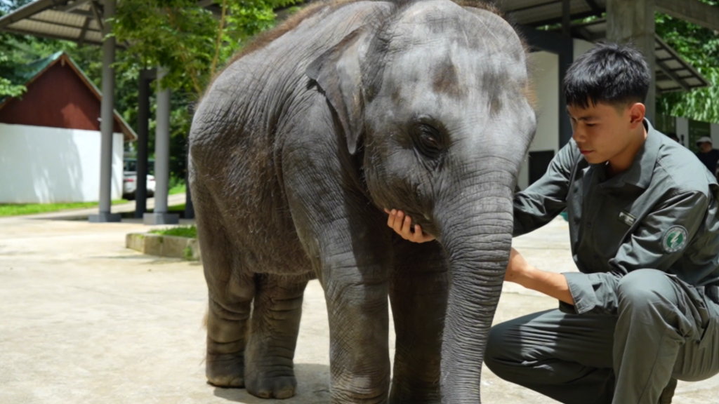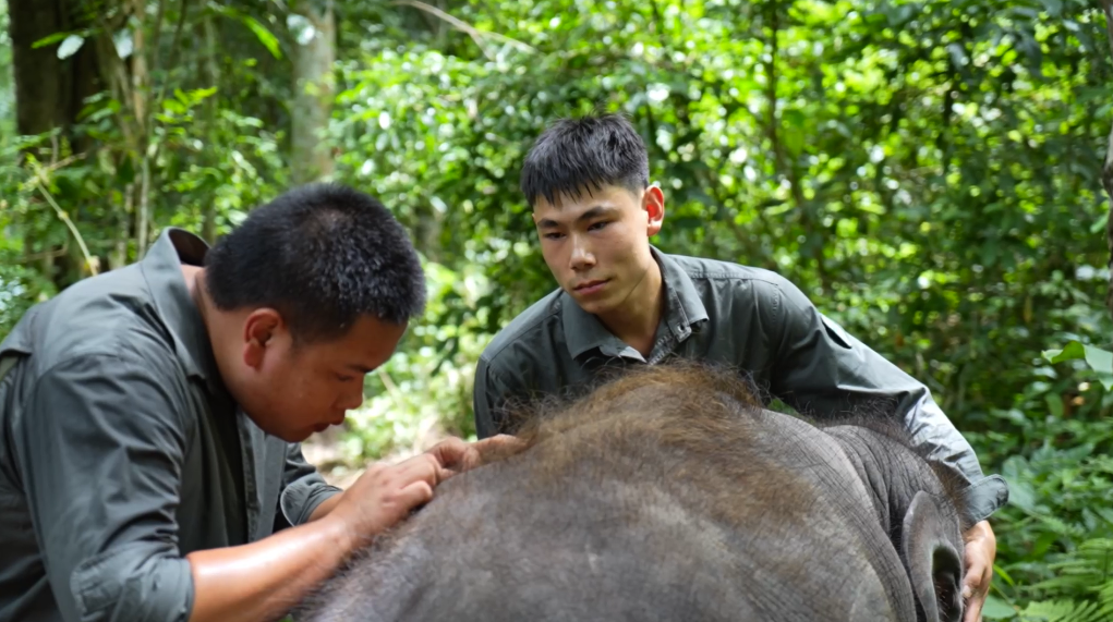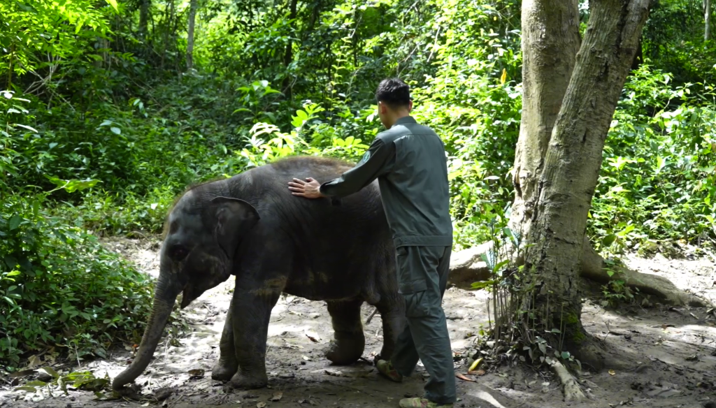 他與同事每天都會為這頭2024年新救助收容的一歲多的亞洲象喂食、檢查身體以及做野外訓練。如今,小象已由100多公斤長到480多公斤,活潑調皮。