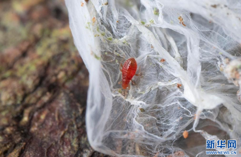 足絲蟻網巢上的中華喜絲蝽若蟲。新華網發