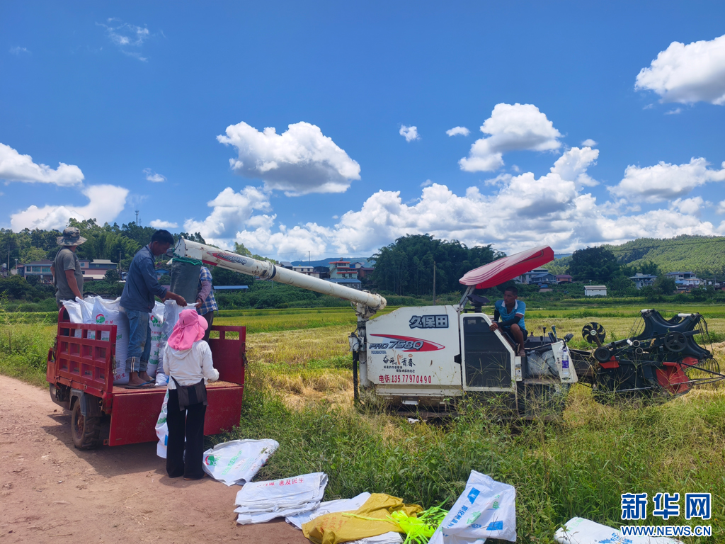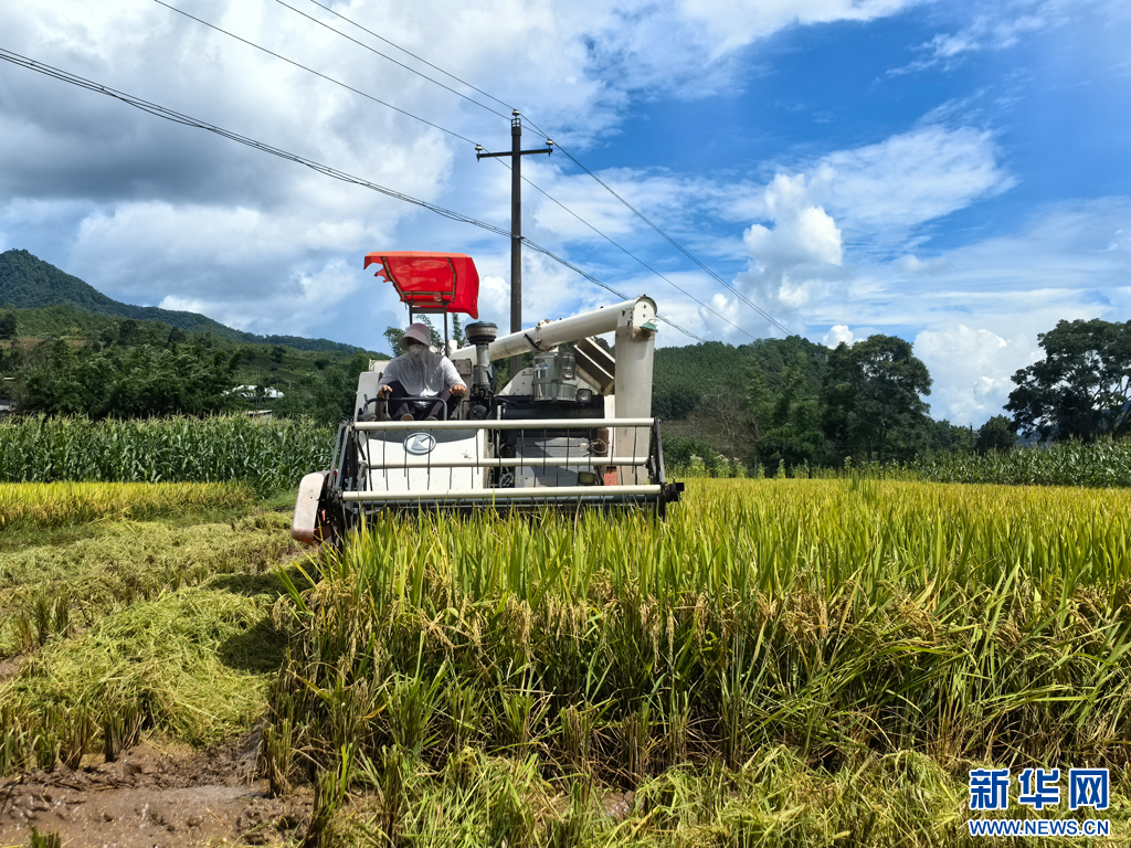 機械化收割水稻(8月13日攝)。新華網發(景谷縣融媒體中心供圖)