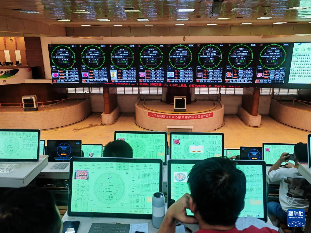 記者在昆明國際花卉拍賣交易中心看到,拍賣大鐘界面顯示著各種花卉的信息,數百名購買商操作著競價器選購鮮花。昆明國際花卉拍賣交易中心副總經理汪洋介紹,這里每天的鮮花交易量都超700萬枝,單日最高交易量超1100萬枝,30%以上的鮮花被各大電商和直播團隊拍下,他們再拿到電商平臺或直播間銷售。