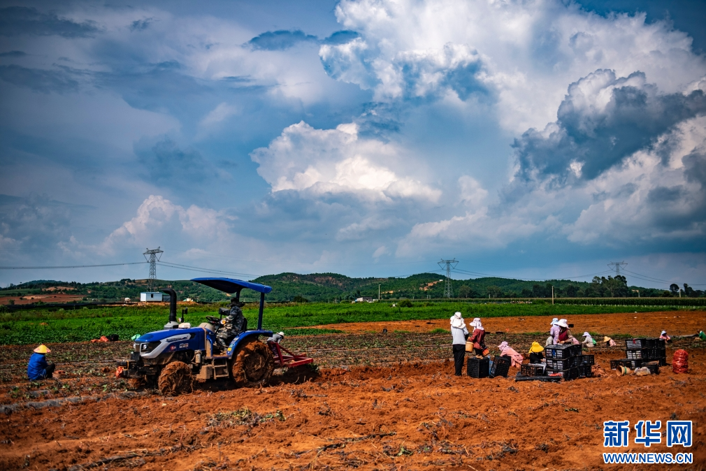 在云南省硯山縣石碑寨村,村民將采收好的紅薯裝車(8月17日攝)。新華網發(熊平祥 攝)