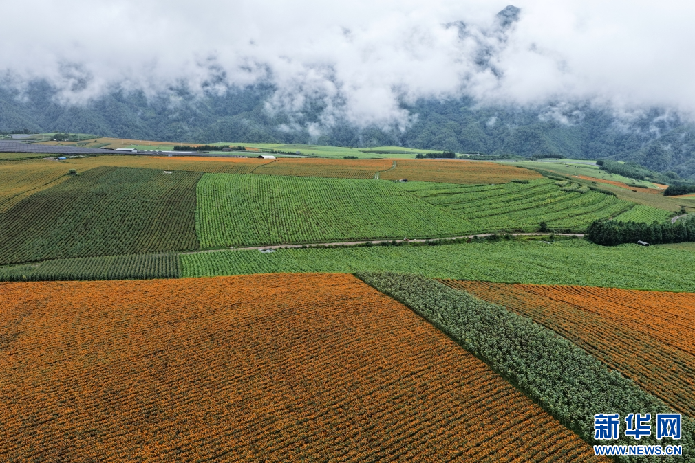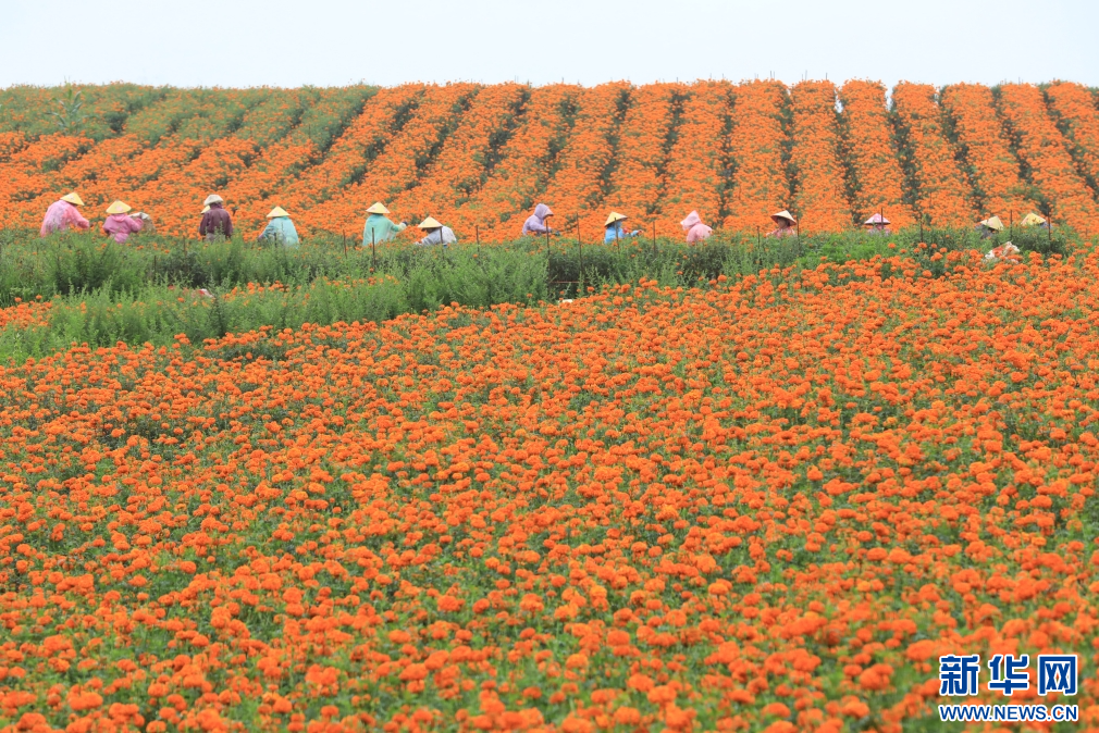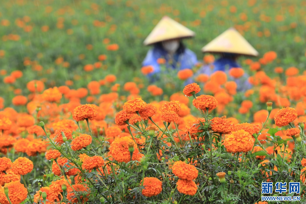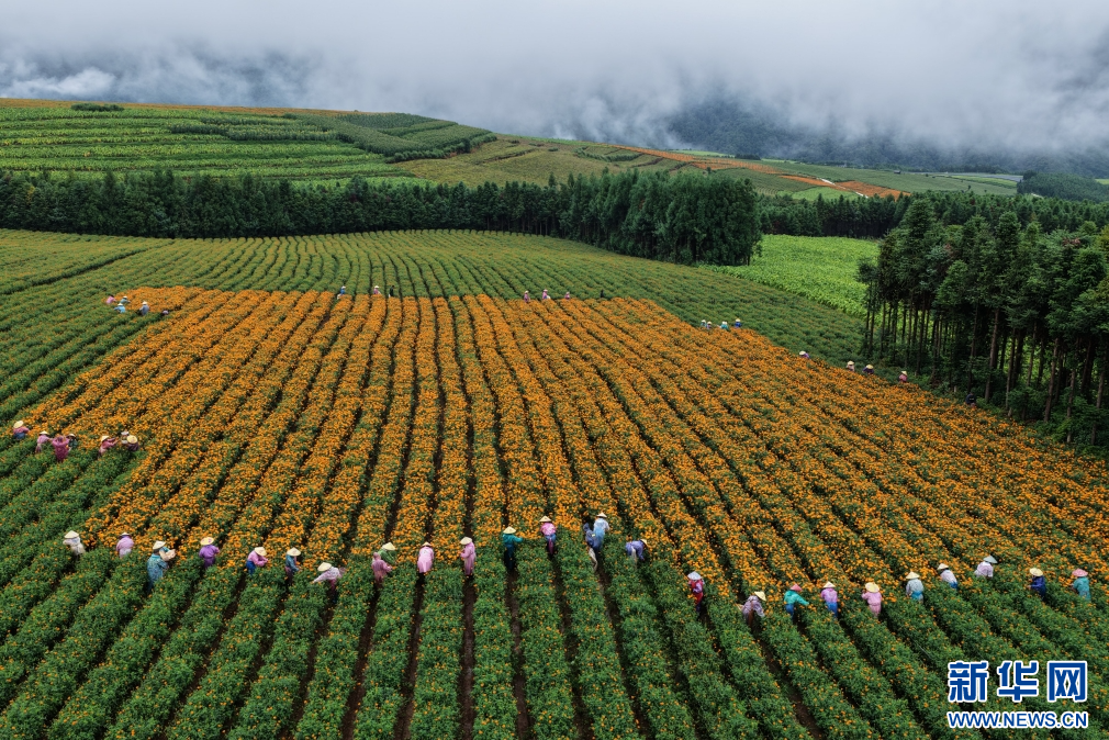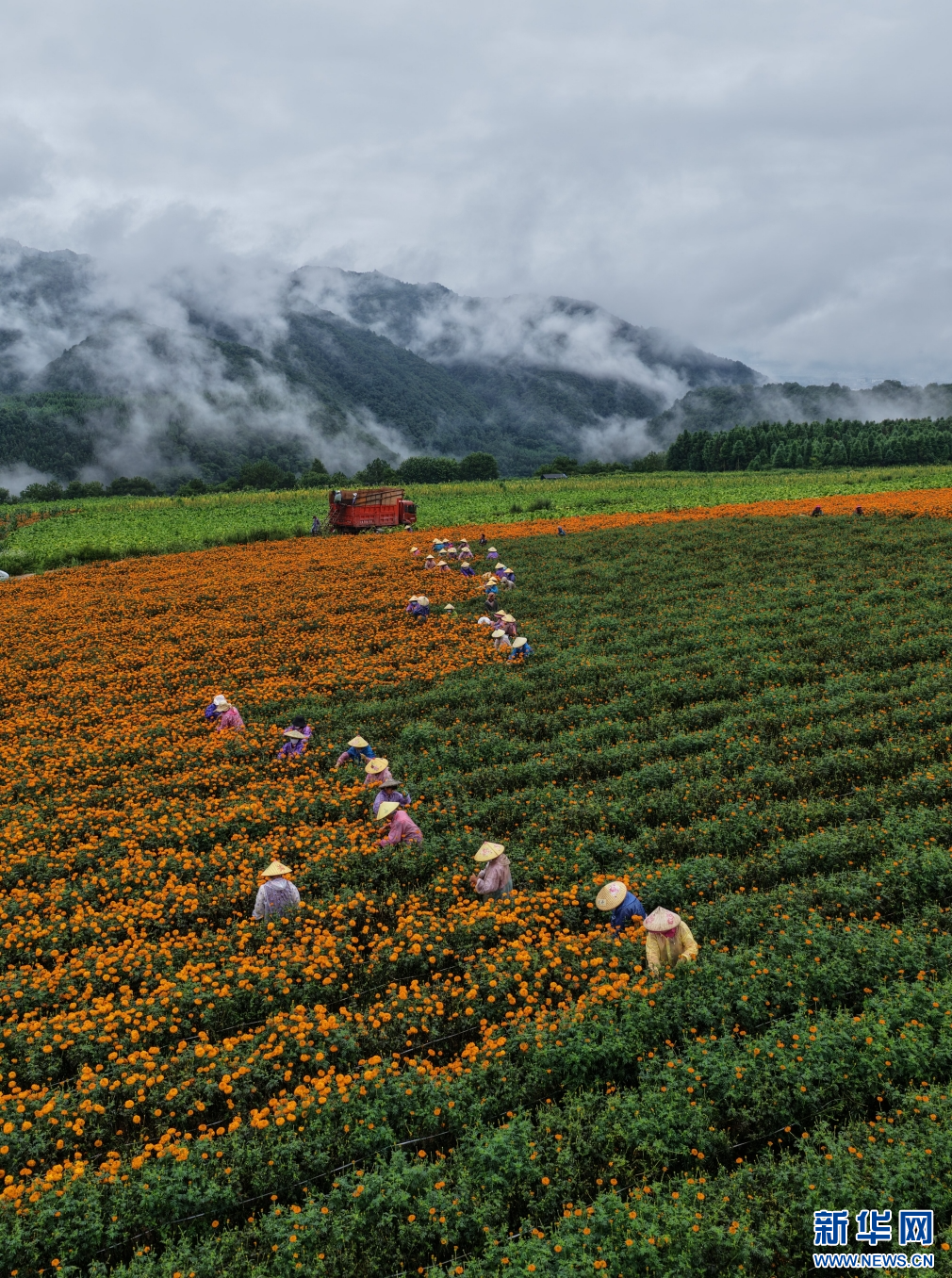 8月23日,農戶在云南省騰沖市明光鎮鳳凰村采收萬壽菊。新華網發(龔祖金 攝)