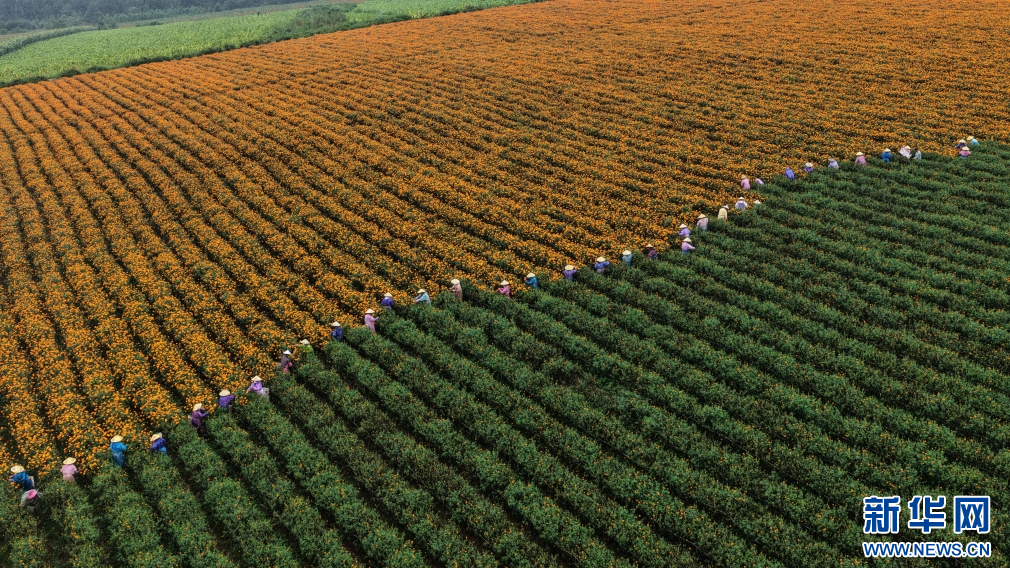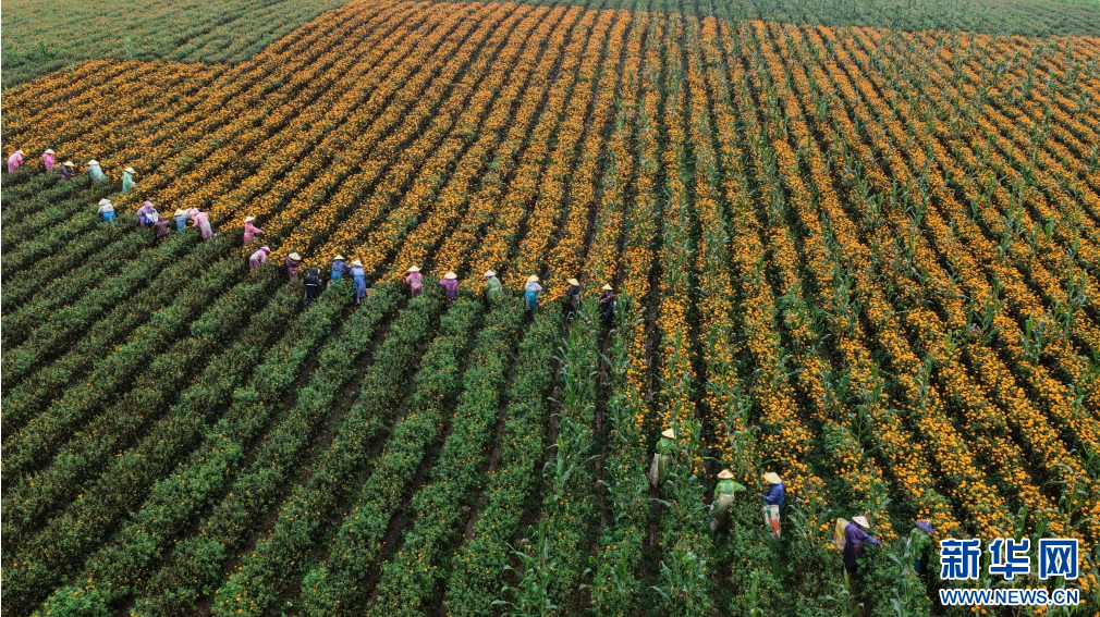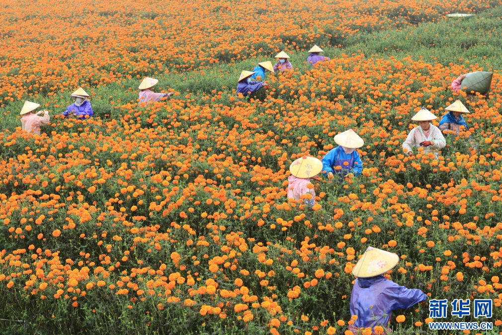 近日,云南省騰沖市明光鎮鳳凰村萬壽菊花開,大片萬壽菊競相綻放,農戶忙著采摘,一派繁忙景象。