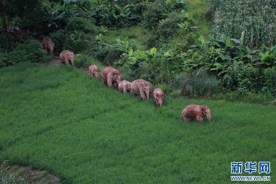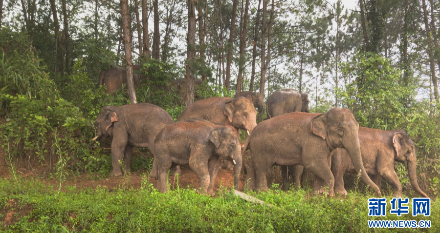 野生亞洲象群在雨中活動(7月1日攝)。新華網發(周晨浩 攝)