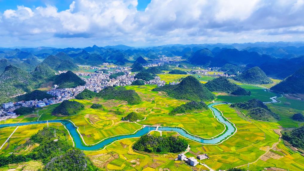 近日,云南省文山壯族苗族自治州廣南縣八寶鎮迎來豐收季。45000畝水稻漸次成熟,廣袤田野化作多姿多彩的色塊。谷浪翻涌,清香四溢,清澈的河水映照著兩岸的綠樹與錯落的民居,一幅動人的豐收畫卷正徐徐展開。