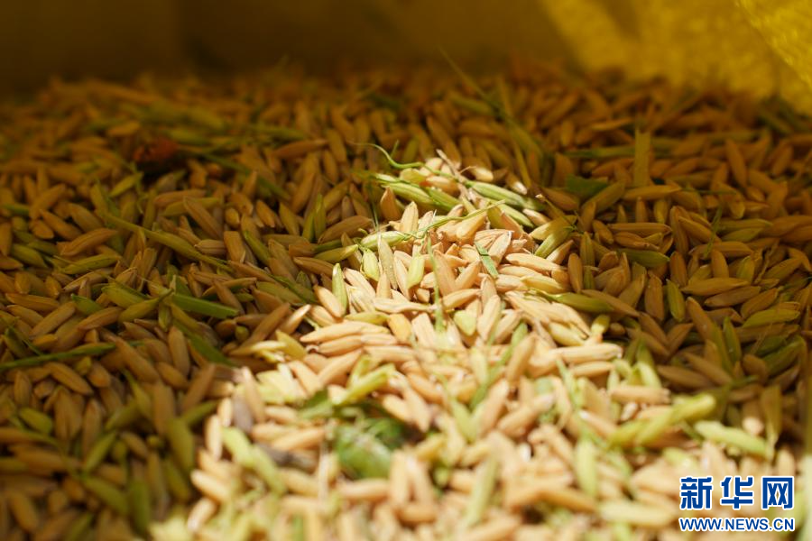 收割機收割后的稻粒(9月7日攝)。新華網發(威信縣融媒體中心供圖)