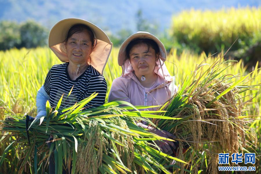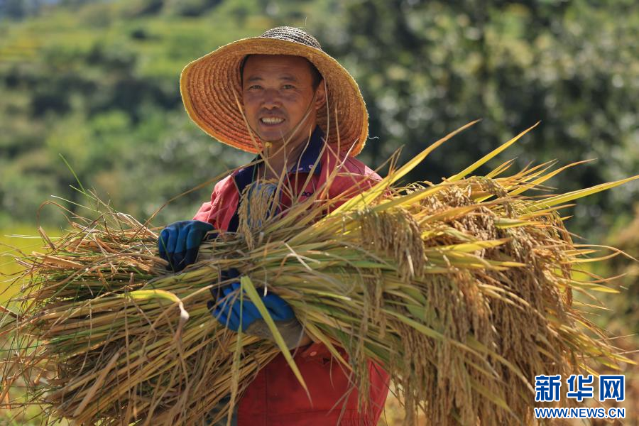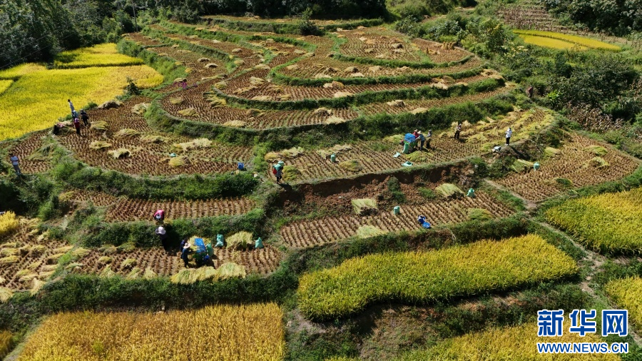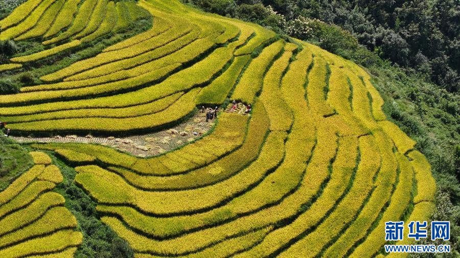 在大關縣,村民收割水稻(攝于9月9日)。新華網發(龍夢 攝)