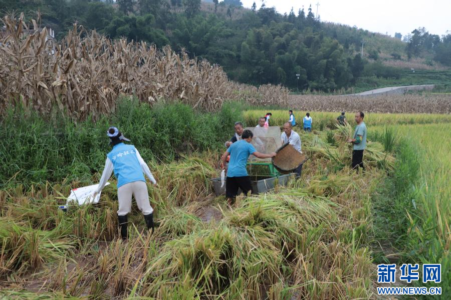 8月28日,水富市云富街道社工與村民幫助特困老人收割稻谷。新華網發(水富市融媒體中心供圖)