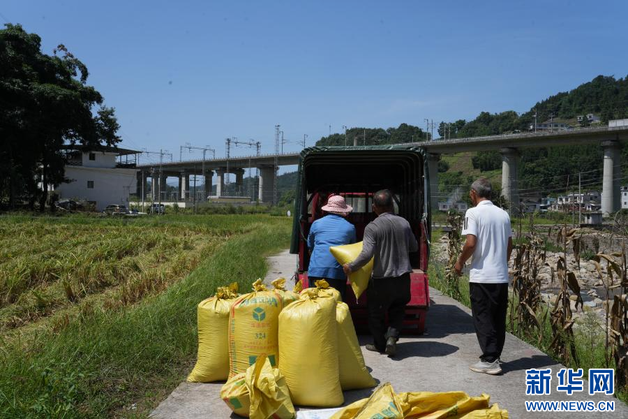 9月7日,威信縣舊城鎮文興村水稻豐收,農戶正在將收割機收割好的稻谷轉運至曬場。新華網發(威信縣融媒體中心供圖)
