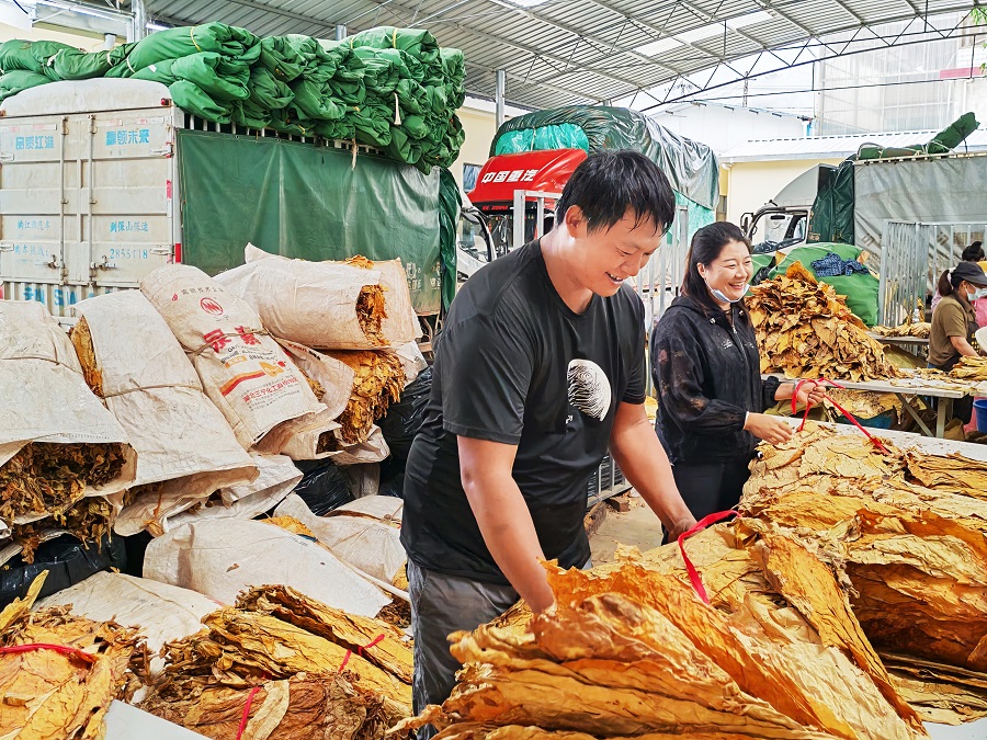 何正銀夫婦正在交售煙葉(8月25日攝)。徐浩 攝