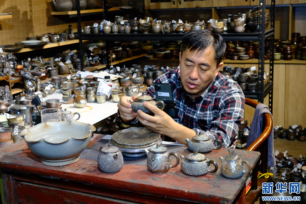 當地企業采用直播形式介紹土陶茶具特性,銷售產品(9月29日攝)。新華網發(張洪科 攝)