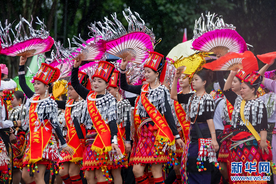 參加目瑙縱歌活動的婦女手持折扇進場舞蹈(10月2日攝)。新華網發(隴川縣融媒體中心供圖)