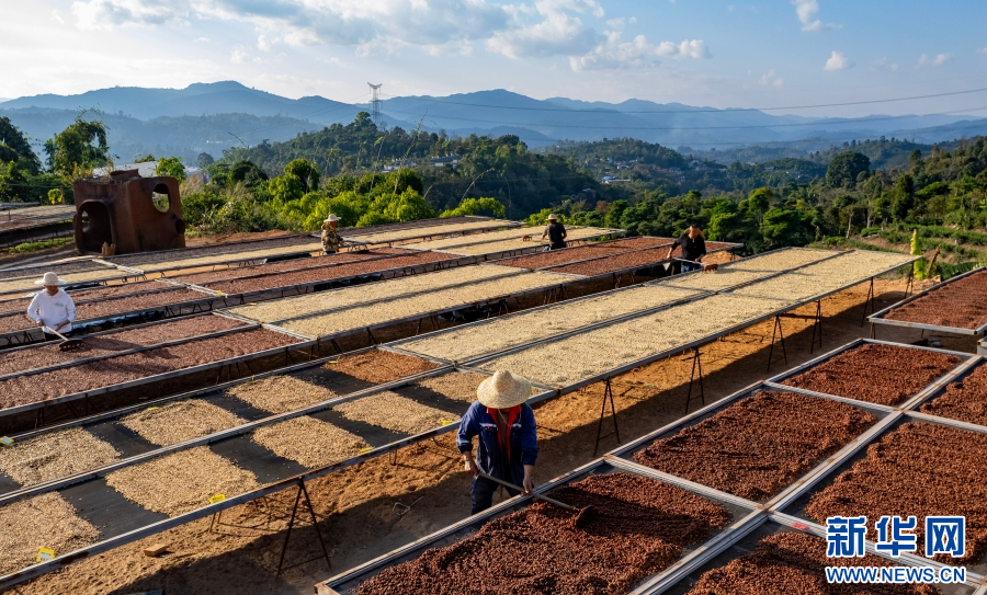 工作人員在思茅區大開河梅子咖啡莊園的咖啡曬場翻曬咖啡(無人機照片,2025年1月7日攝)。新華社記者 陳欣波 攝