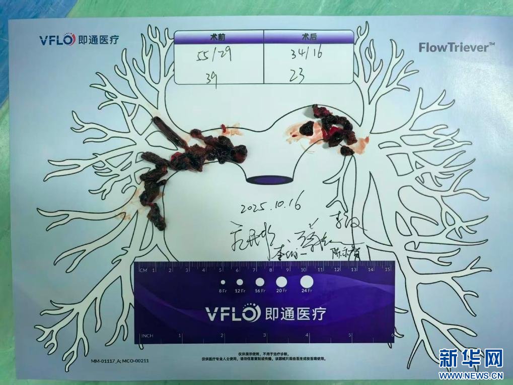 手術過程中,心臟大血管外科團隊精準操作取栓系統,使用8mm粗細的導管安全進入患者的右心房,穿過三尖瓣,經過右心室出口直達患者的肺動脈主干,迅速取出肺動脈內的大量急性、亞急性血栓。同時使用血液回輸系統,將抽吸出的大量血液分離、清洗,并及時回輸至患者體內。此舉在清除血栓的同時顯著減少患者因手術導致的自身血液丟失,全過程未額外輸注其他血制品,患者失血僅約150毫升。