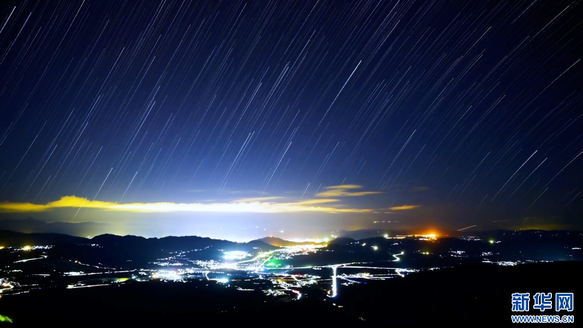 近日,攝影師在云南省騰沖市新岐冒盔山用延時攝影拍攝到夜空群星璀璨,星軌在山頭旋轉,夢幻而浪漫。(趙輝 李諺 錢林川)