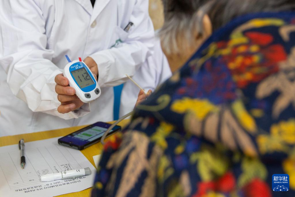 沾益區西平街道社區衛生服務中心醫生為糖尿病患者測量血糖值(2025年10月20日攝)。新華社發(楊俊鵬攝)