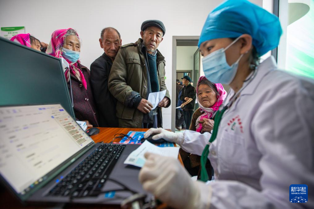 沾益區金龍街道社區衛生服務中心醫生為老年人將體檢情況錄入系統(2025年3月12日攝)。新華社發(楊俊鵬攝)