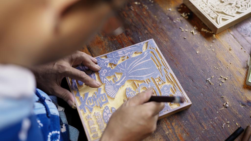 7月5日,喜洲匠志集民藝中心甲馬版畫藝術館內,工匠正在雕刻甲馬。新華社發(羅曉川 攝)
