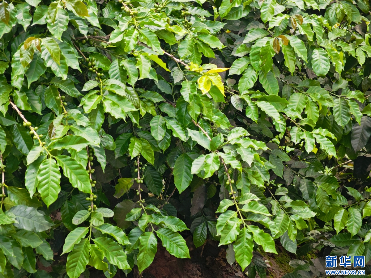 普勝村山坡上的咖啡樹掛滿了綠色的果實,長勢喜人(7月8日攝)。新華網發(楊亦麟 攝)
