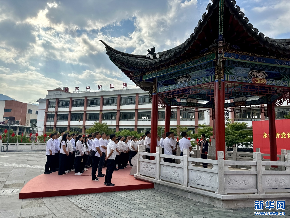 周林為參觀者講述民族團結誓詞碑故事(資料圖)。新華網發(董潔 攝)
