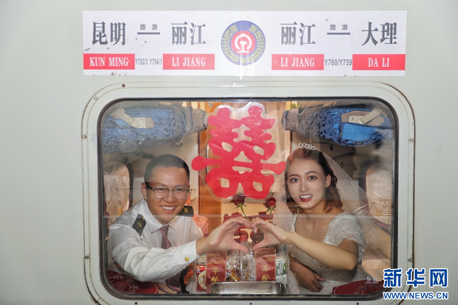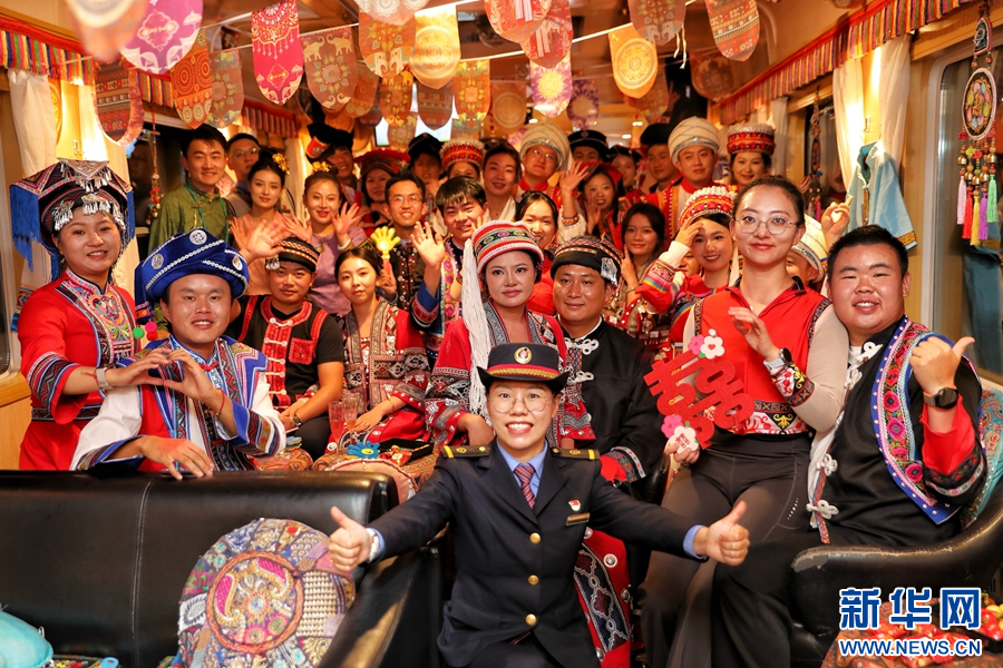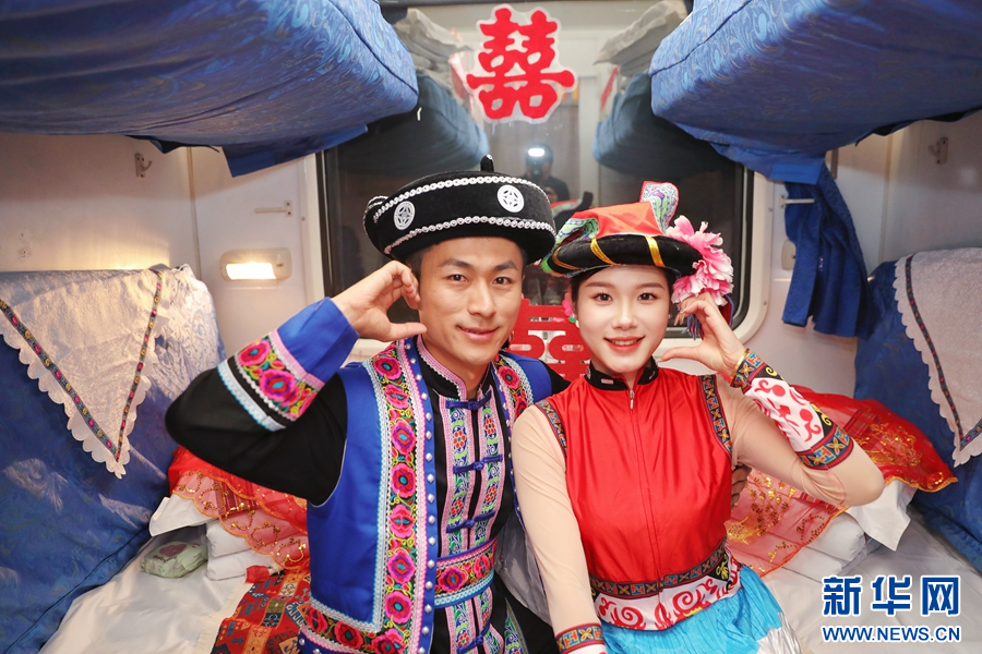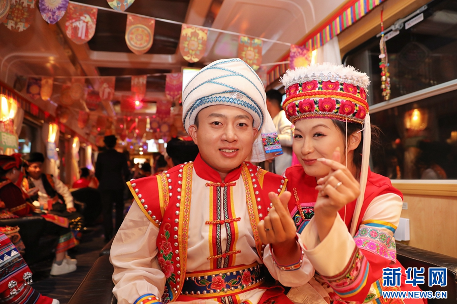 車廂內,一對身著民族服飾的新人面對鏡頭比心(攝于10月28日)。新華網發(楊紫軒 攝)