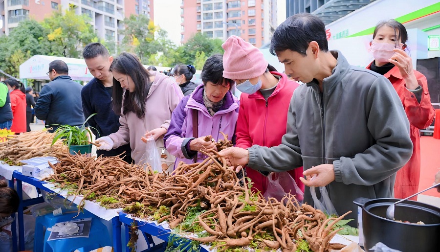 在主會場的鮮貨發布環節,鮮三七、鮮人參、鮮天麻、鮮石斛等道地藥材依次亮相。工作人員細致講解藥材的產地、生長環境與功效特點。