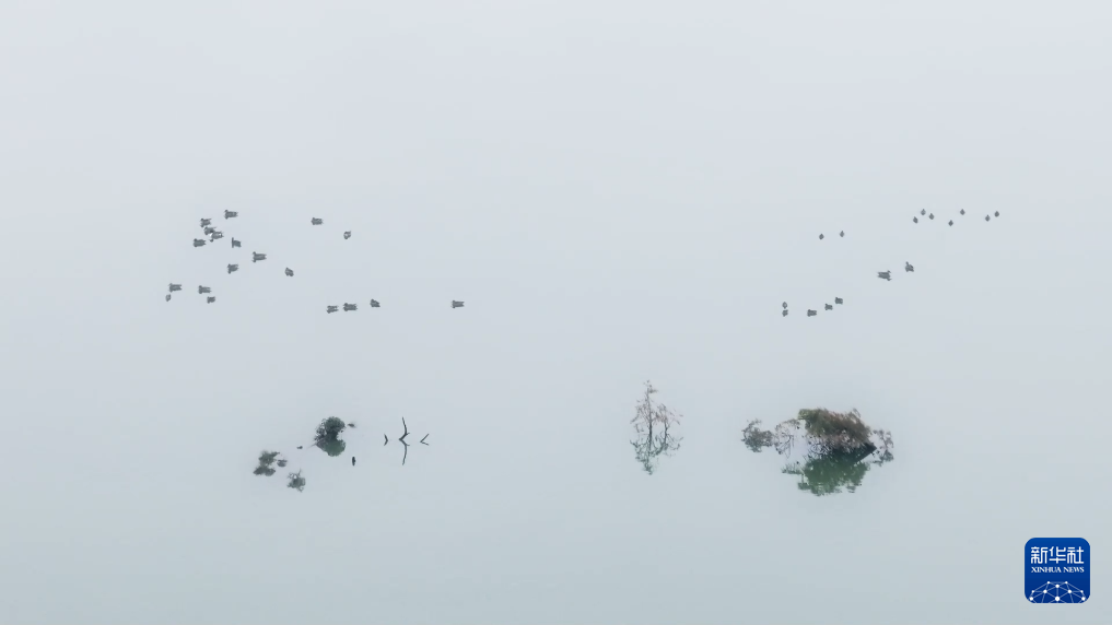 初冬雨后,傍晚時分,云南晉寧南滇池國家濕地公園鯨魚灣薄霧籠罩。航拍鏡頭下,湖面如鏡,候鳥翩躚,靜動交織,宛如一幅韻動且極簡的水墨畫,展現出南滇池濕地的寧靜與靈動。